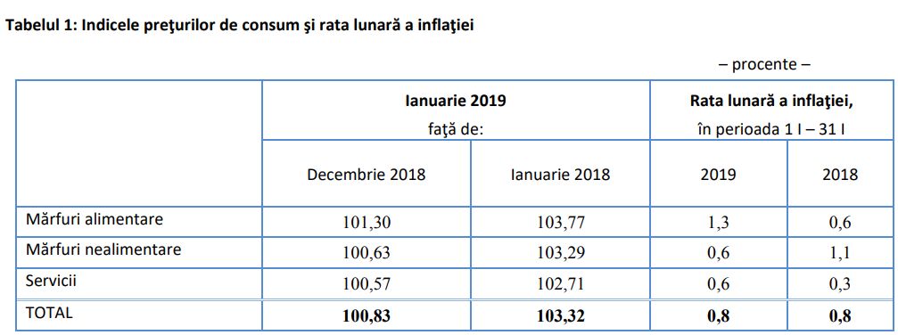 În ianuarie, inflația (lunară) a fost de 0,8% față de decembrie 2018, cu scumpiri de 1,3% la alimente, creșteri de 0,63% ale tarifelor pentru servicii și majorări de prețuri de 0,57% la mărfurile nealimentare.